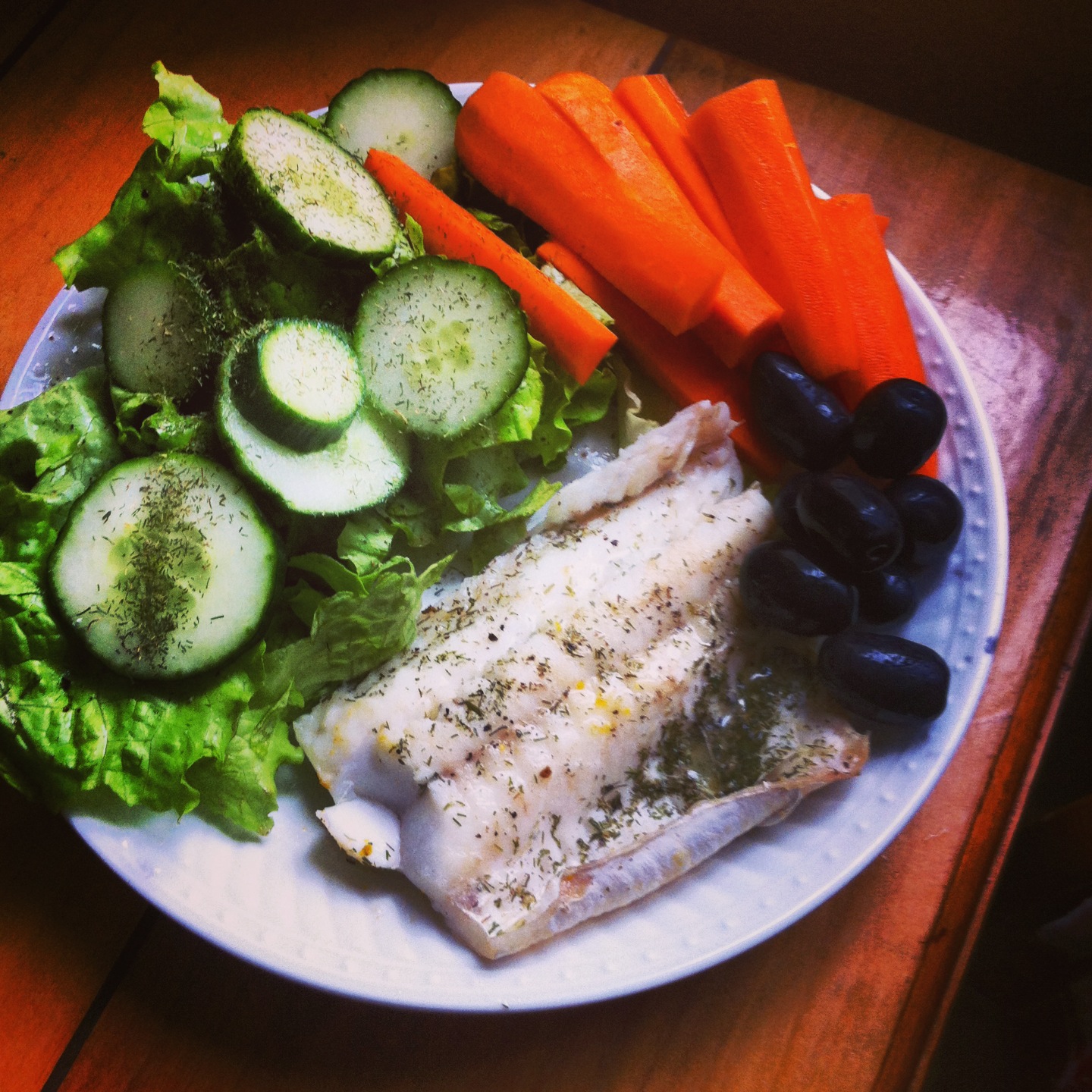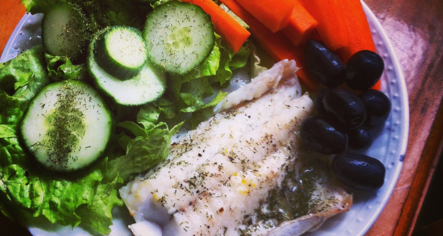 Merluza a la mantequilla con eneldo junto a una ensalada verde, zanahorias y aceitunas. Paleo, primal, sin gluten, sin azúcar
