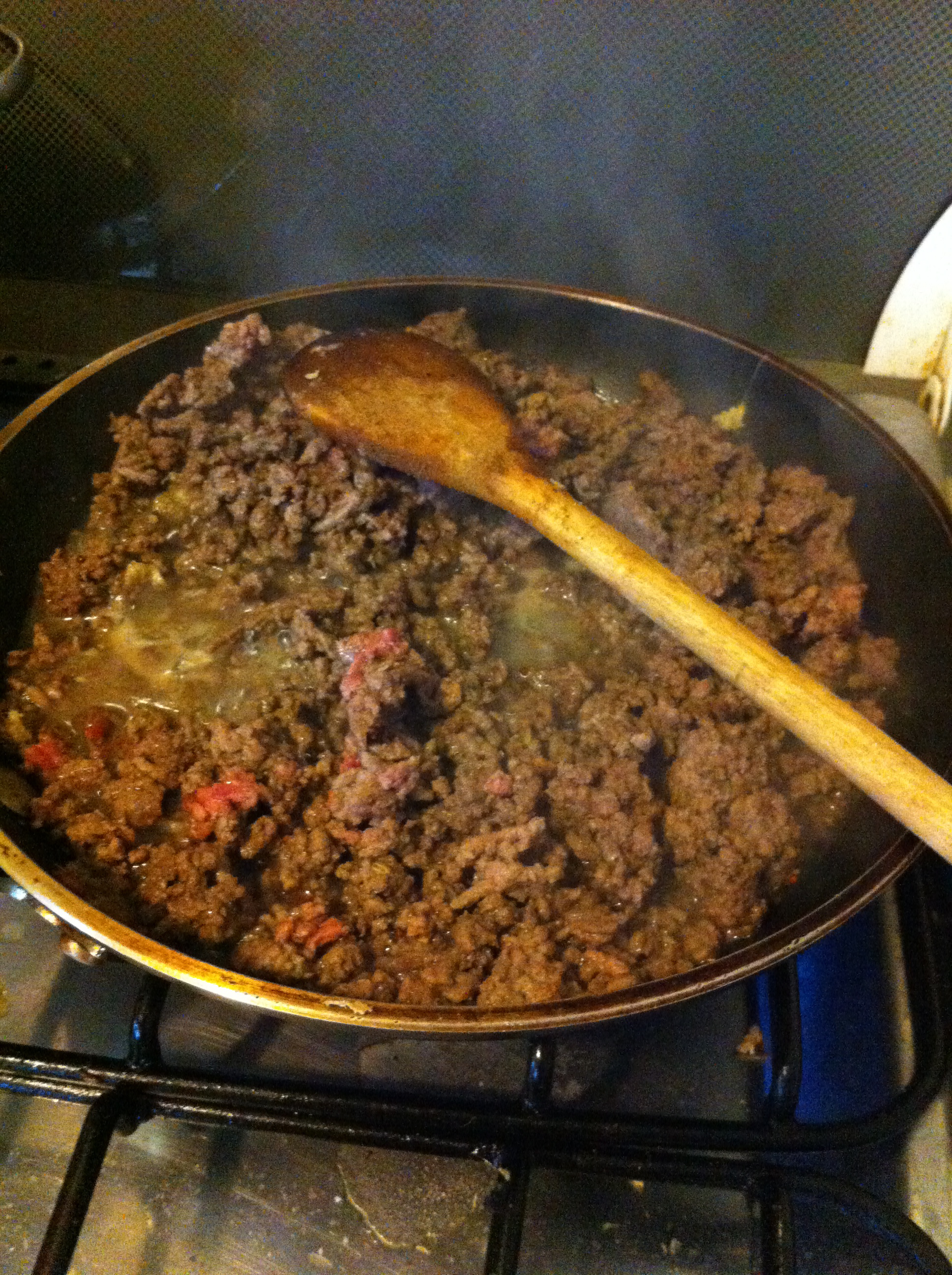 - Mientras se esté cociendo la papa, pon un sartén a fuego medio. Pon algo de mantequilla en el sartén y, cuando esté derretida, añade 0,5 cucharaditas de semillas de mostaza. Deja que se fríen un minuto, revolviendo constantemente, hasta que comiencen a soltar su fragancia. Luego agrega 2 cucharaditas de comino, 2 cucharaditas de cúrcuma (esto lo mancha TODO así que con cuidado, tanto al cocinar como al comer), 1 cucharadita de canela molida, 1 cucharadita de jengibre fresco rallado. Agrega el kilo de carne molida, sal de mar y pimienta. Deja el sartén al fuego, revolviendo de vez en cuando para evitar que la carne se pegue al fondo del sartén. Cuando la carne aún esté un poco rosadita, agrega las pasas. Al estar completamente cocida la carne, pruébala (muy importante – siempre hay que probar todo a medida que lo vamos preparando). Si le falta algo, agrégale lo que crees que le hace falta.