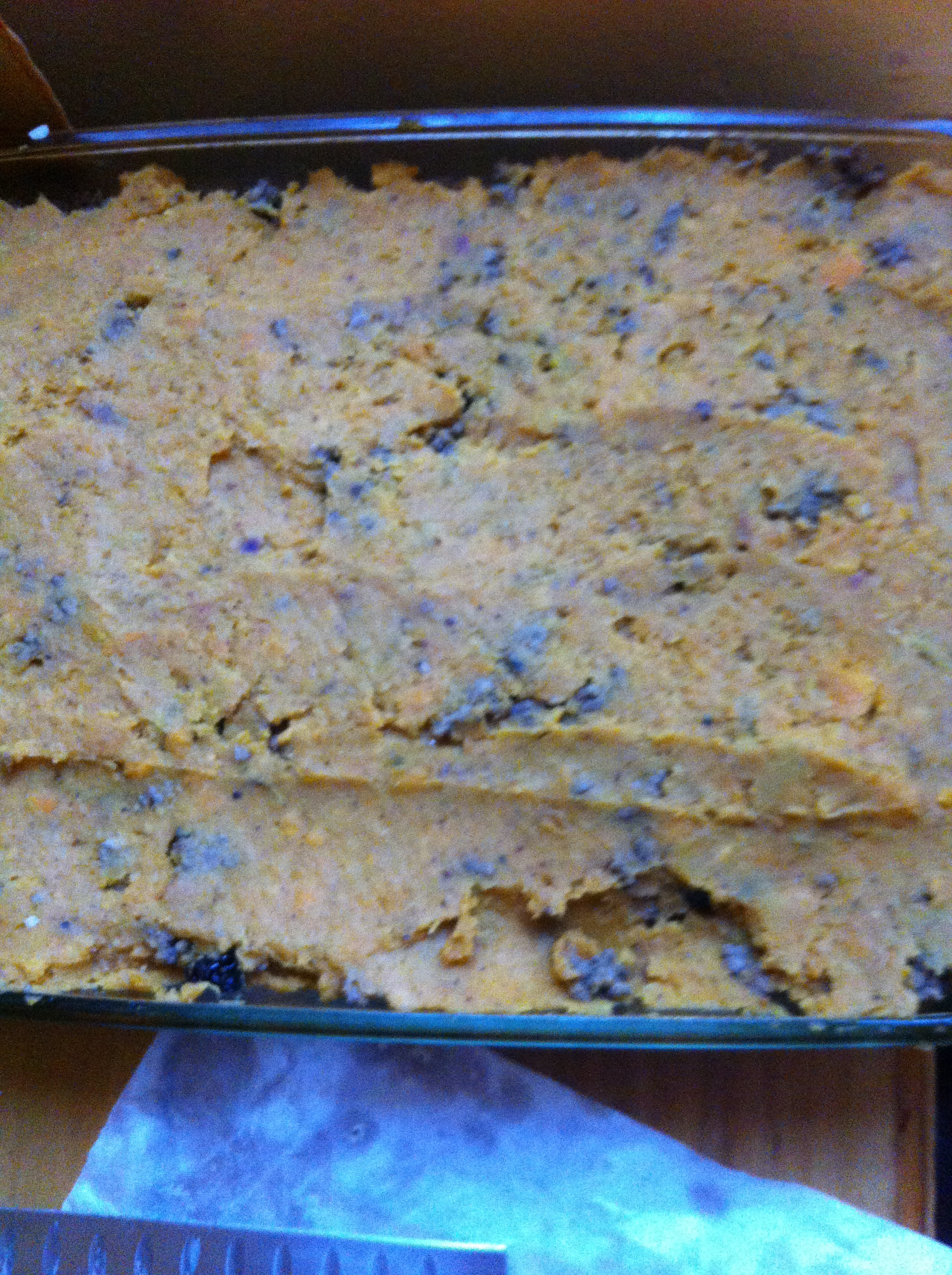 7. En el fondo de una fuente de vidrio de 30x20cm, esparce el puré de zapallo hasta que todo el fondo de la fuente esté cubierta.
