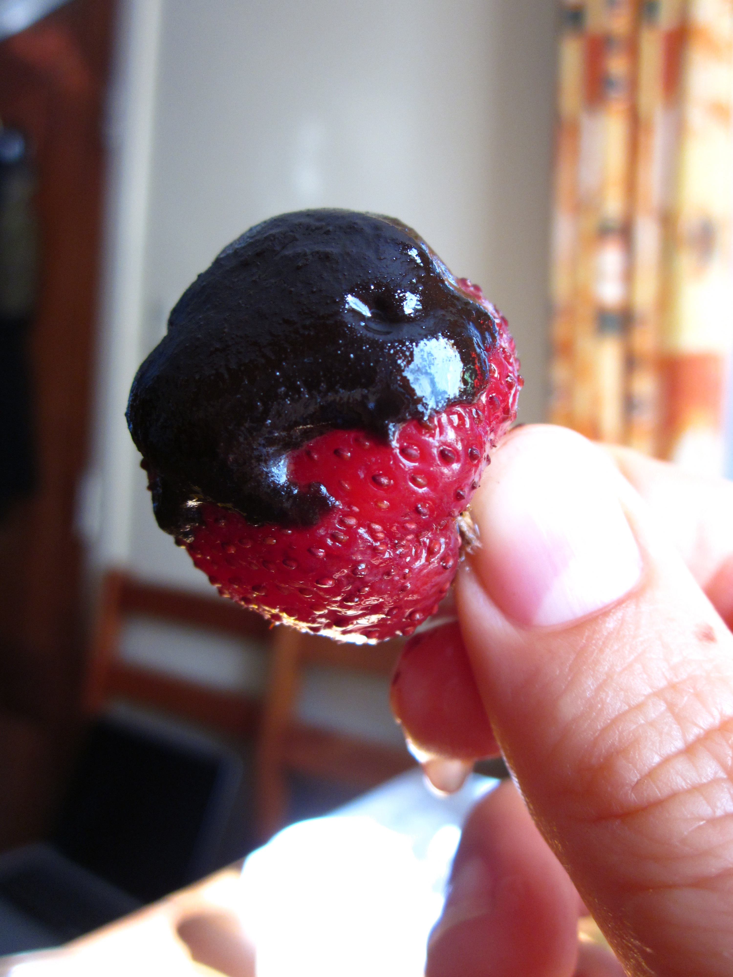 OK, chiquillos, esta receta es ULTRA FÁCIL!!! No sé tú, pero yo siempre quiero comer chocolate. O sea… siempre. Y hace dos semanas decidí dejar de comer chocolate como una especie de experimento (parte esencial de mi proceso de cómo he averiguado a cuáles cosas les soy intolerante o sensible). Verán, el chocolate es, trágicamente, uno de esos alimentos que muy comúnmente provocan una reacción similar a la que provoca el gluten en personas sensibles, intolerantes o alérgicas. Y como mi dermatitis atópica reacciona negativamente al exponerme al gluten, se me ocurrió que sería una buena idea dejar de comer chocolate para ver si en una de esas mi piel estaba poniéndose roja y reseca porque pensaba que el chocolate era gluten. PEEEEERO, por puro que yo no esté comiendo chocolate no significa que no voy a compartirles esta receta ultramegasuper sencilla y riiiiiica. A mí me encanta untar frutillas (fresas) en esta salsa. En invierno, corto dos kiwis en trocitos y los echo a un bol con la salsa. O puedes usar frambuesas, frescas o congeladas, uvas congeladas, naranjas cortadas en trocitos… El cielo es el límite (traducción literal del inglés, horror de horrores, pero no se me ocurre la expresión en castellano). Disfruten.