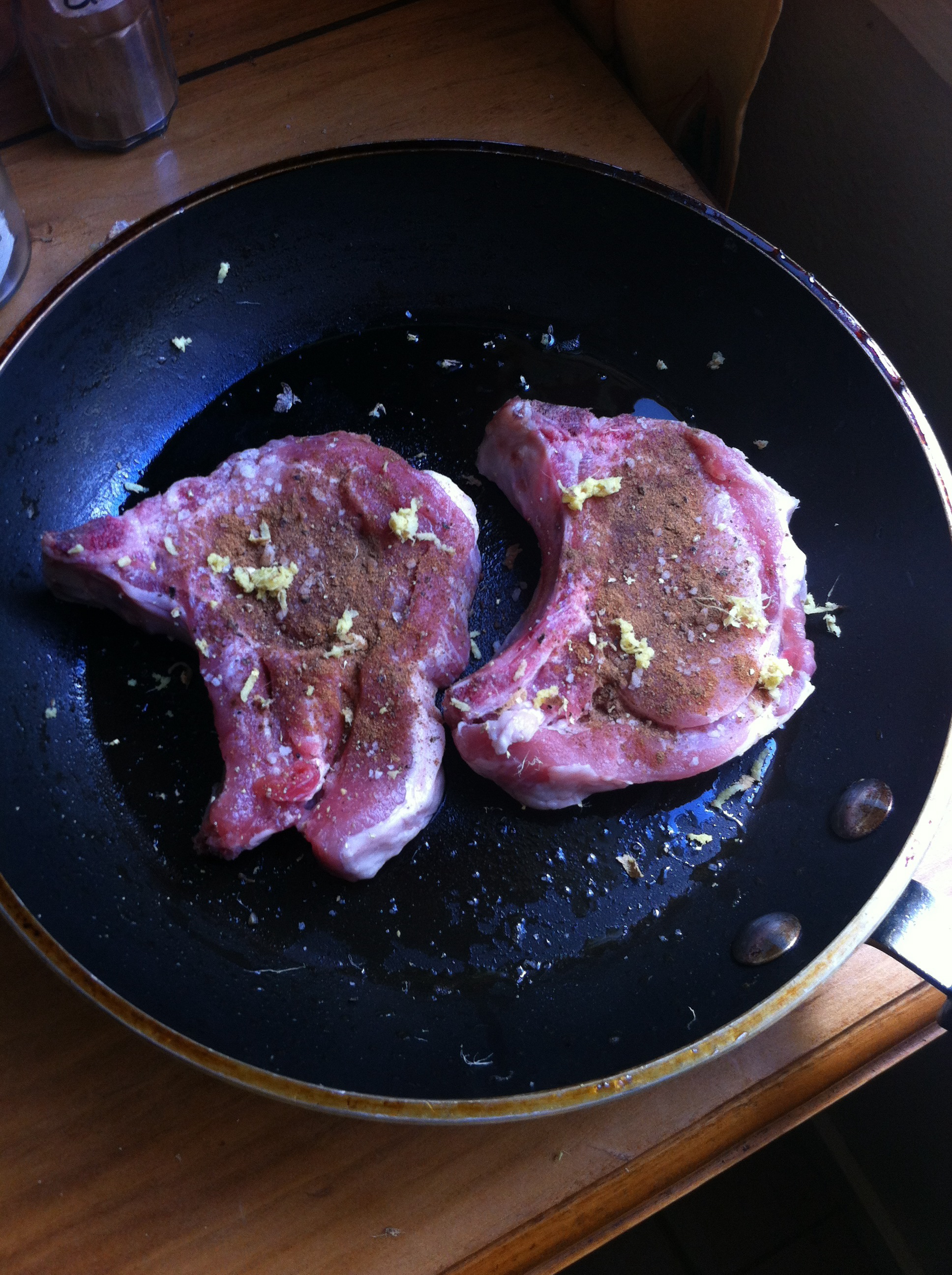 Poner chuletas en la sartén. (Si quieres probar con rodajas de manzana, éste sería el momento para agregarlas, con un poquito de canela espolvoreada en cima.)