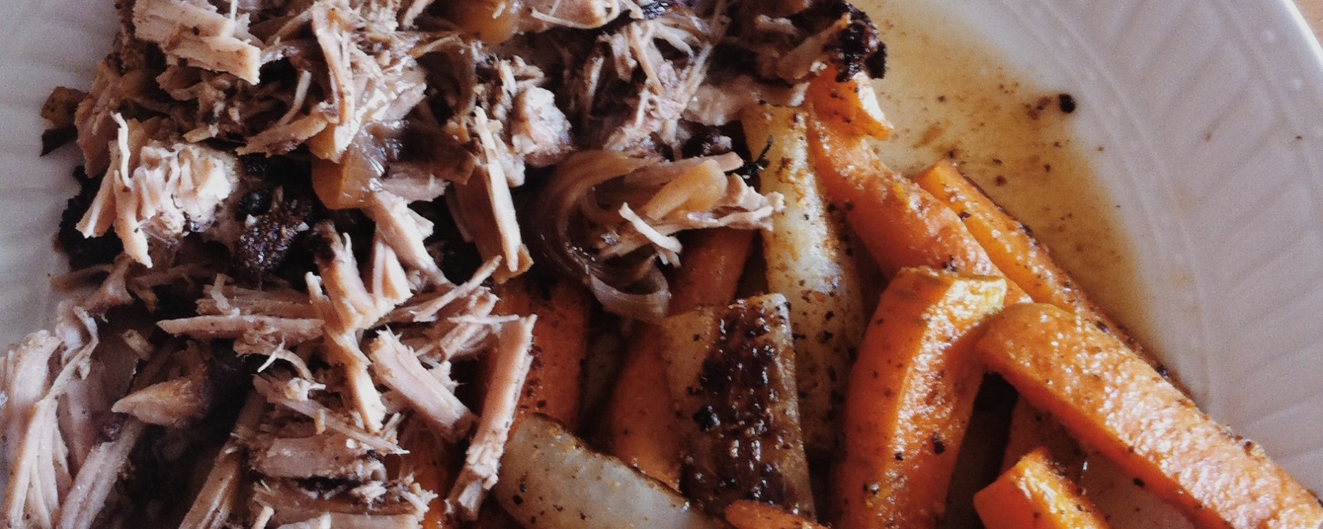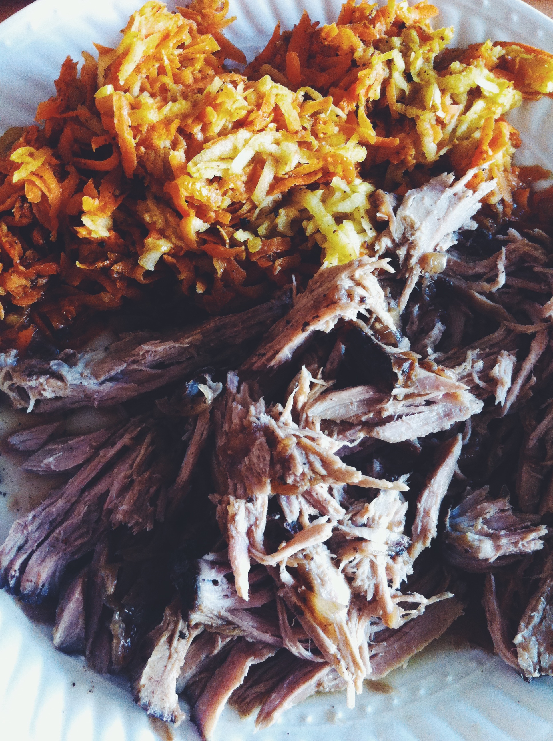 Antes de hacer esta receta (inspirada por esta creación de Mel Joulwan), no sabía qué corte del cerdo vendría a ser el “pork shoulder”, porque obviamente no se le dice “hombro de cerdo”… al menos, no en Chile. Así que fui al carnicero y le pregunté qué parte del cerdo me daría un buen mechado, y me dijo que el lomo sería ideal. Le pregunté si la pulpa también serviría (que me parece es similar al lomo pero ya no recuerdo qué parte del cerdo me dijo que era), y me respondió que sí. Y como yo siempre estoy buscando cómo ser Paleo sin quedarme en la banca rota, decidí probar con la pulpa, que es un corte más barato (será por lo feo del nombre…) Y quedó “de pelos”, como diría Bart.