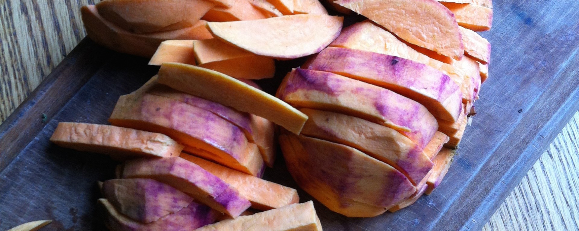 Lava y pela las papas camotes y córtalas en palos, como del tamaño de papas fritas rústicas. (Si las cortas en palos grandes, tomarán más tiempo en asarse y no serán crujientes. Si las cortas en palos medios delgados, se asarán más rápido y serán algo crujientes, pero también podrán quemarse más fácilmente.)