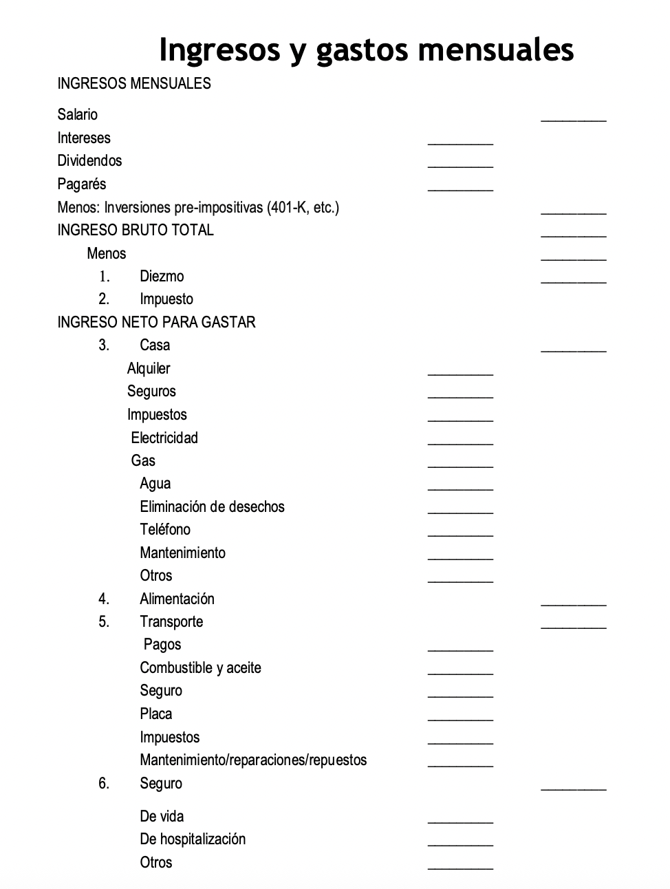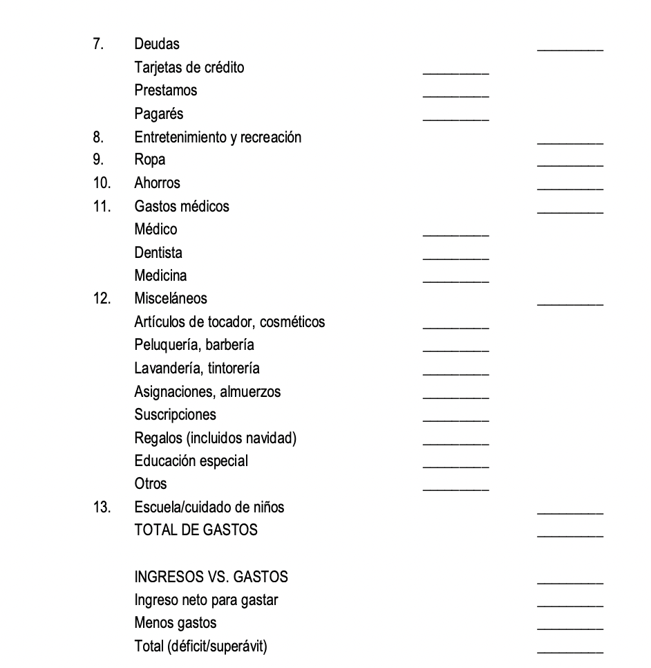 Completa la planilla a continuación con tus ingresos y gastos actuales. Si la suma iguala más que tus ingresos, completa la planilla nuevamente pero con montos ajustados para que la suma de tus gastos sea igual o menor a tus ingresos. Esta última planilla es tu nuevo presupuesto.